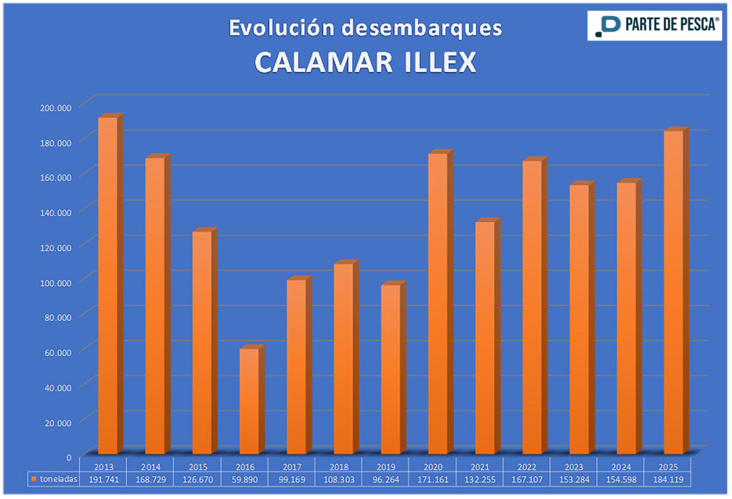 Desde 2008 a esta parte no se volvió a conseguir volúmenes por arriba de las 200 mil toneladas anuales; siendo en 2013 cuando se contabilizaron descargas de calamar Illex por 191.741, es decir, valores similares a los de este año.