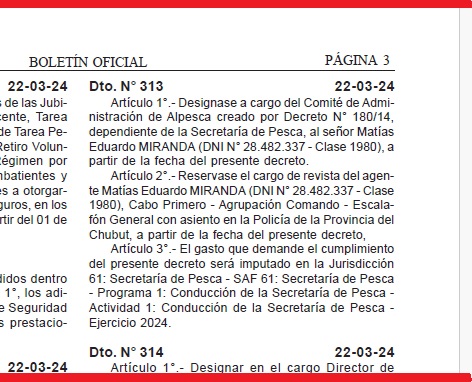 Hace una semana, con la firma del director General a cargo del Comité de Intervención de Alpesca, Matías Eduardo Miranda (Cabo 1° de la Policía del Chubut), contando con la anuencia del secretario de Pesca, Andrés Arbeletche, se notificó a la empresa que se consideraba “extinguido el Contrato de Arrendamiento de Bienes y Charteo de Buques”.