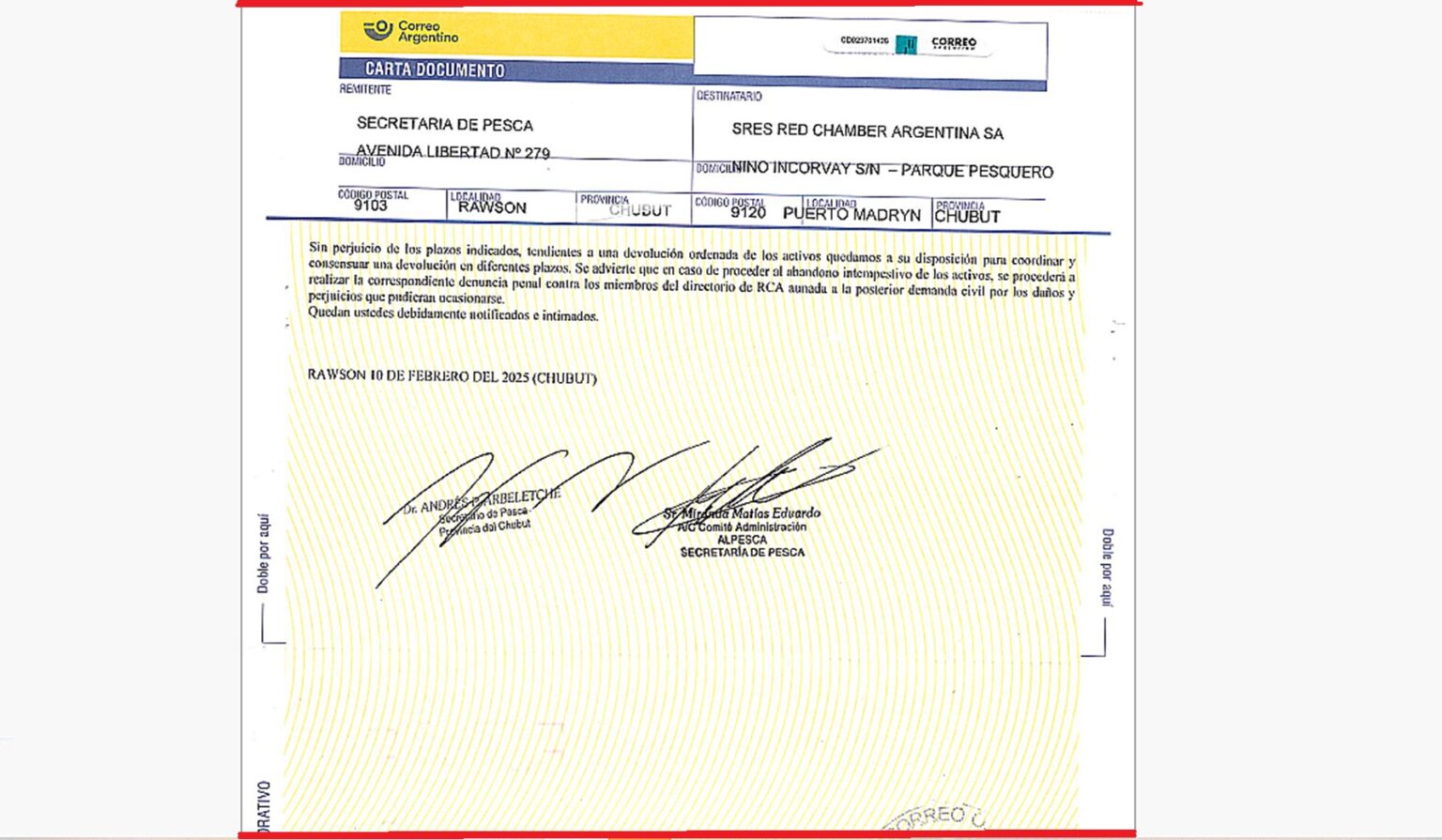 El Interventor de Alpesca y el Secretario de Pesca piden finalmente el listado de personal, advirtiendo que el Gobierno se hará cargo de los salarios a partir de ahora. “Se les requiere remitan copia de la totalidad del último recibo de haberes del personal dependiente de RCA que pertenecía a Alpesca S.A. o copia del legajo de los mismos con sus respectivas cuentas bancarias a los efectos de garantizar oportunamente sus haberes por otros medios. Por último, se les hace saber que en el plazo de 90 días deberán amarrar los buques Promarsa III y Cabo Vírgenes en el Puerto de Madryn con su tripulación de guardia mínima, cuyos haberes serán solventados por la Provincia del Chubut”, agregan.