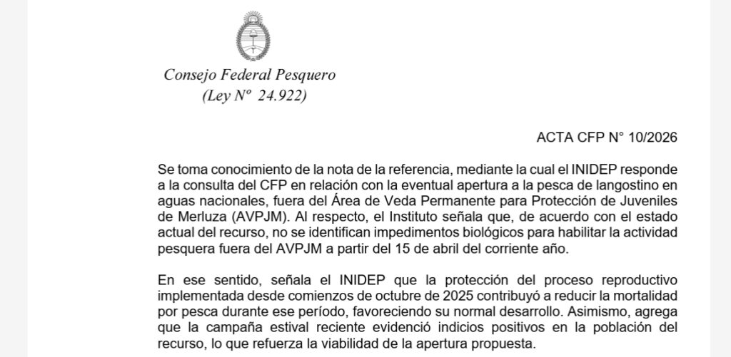 El Instituto Nacional de Investigación y Desarrollo Pesquero, a través de Nota N° 31/26 respondió a la consulta del CFP en relación con la eventual apertura a la pesca de langostino en aguas nacionales, al respecto, el INIDEP señala que, “de acuerdo con el estado actual del recurso, no se identifican impedimentos biológicos para habilitar la actividad pesquera fuera del AVPJM a partir del 15 de abril del corriente año”.