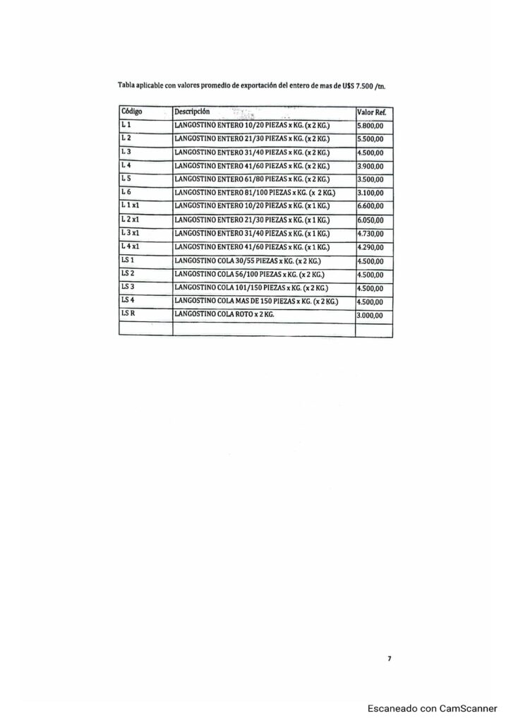 En el contexto indicado el “sueldo proporcional por producción” en los buques congeladores langostineros “se liquidará en función del tonelaje neto de langostino congelado descargado, sin incluir el peso de los envases ni del agua, multiplicado por los valores que, por tonelada de producto, y conforme su tamaño y procesamiento a bordo se asignan en el ANEXO I, que se adjunta”. “El valor resultante será multiplicado por el porcentual del dólar vigente en cada Convenio Colectivo, aplicable sobre la cotización tipo comprador del dólar estadounidense billete fijado por el Banco Nación Argentina del día de la efectiva descarga, y el porcentual de participación de cada categoría”, dice la propuesta.