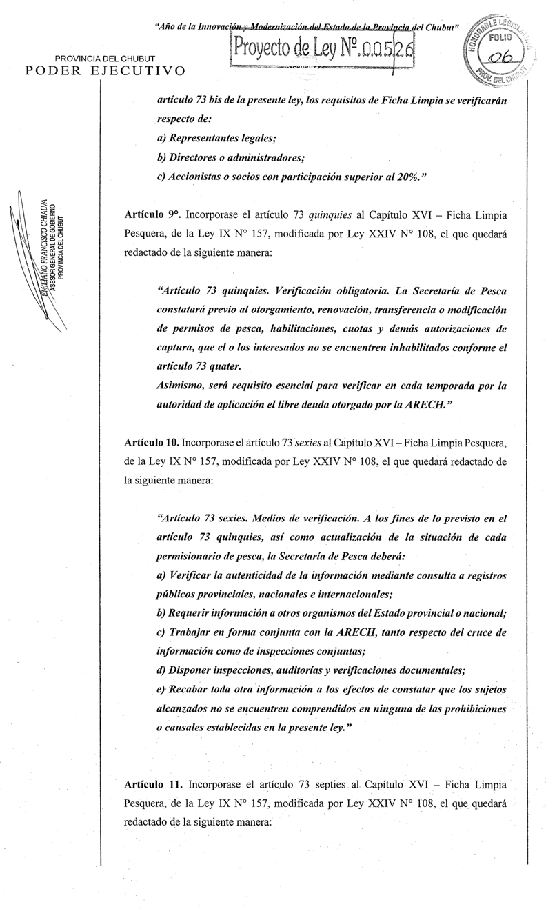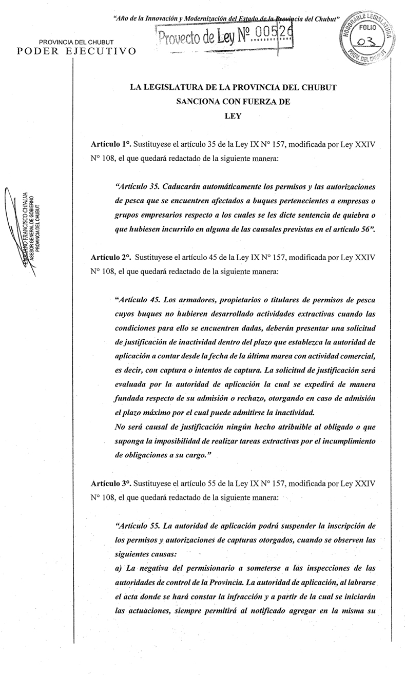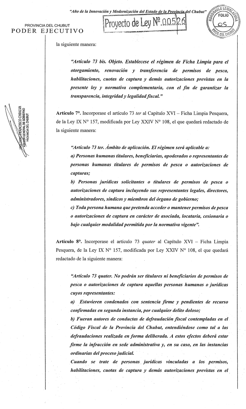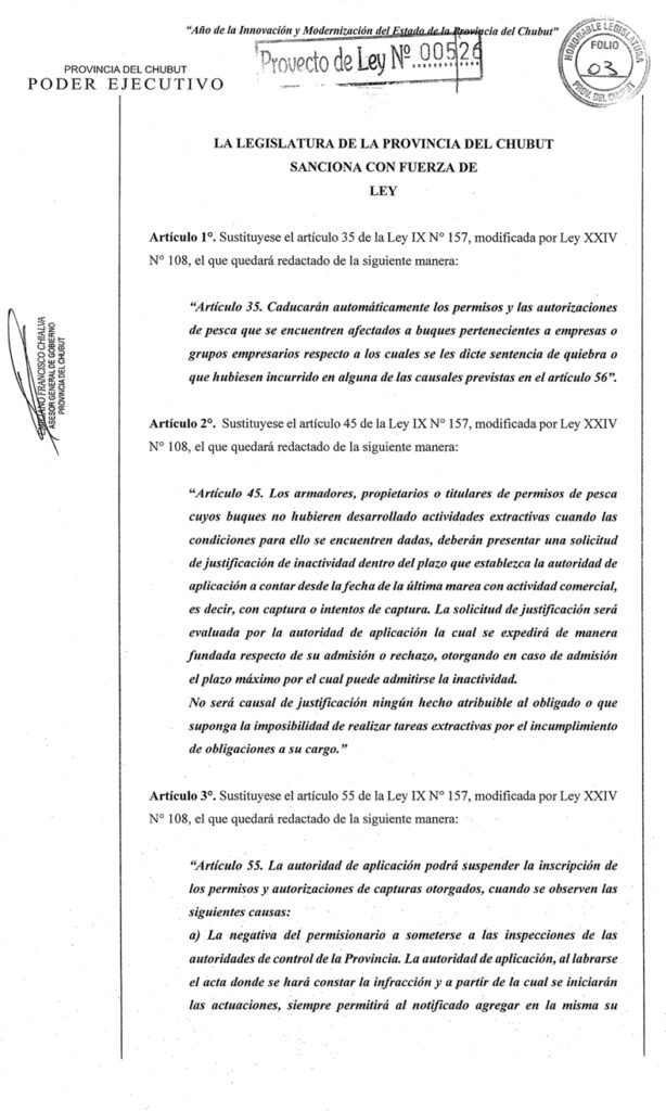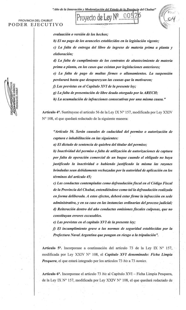 A las 19:15 horas del viernes 20 de febrero ingresó en la Legislatura de Chubut el Proyecto de Ley N° 005/2026 por medio del cual se introducen profundas y sustanciales reformas a la Ley IX N° 157 – “Ley de Política de Desarrollo Pesquero Sustentable”.