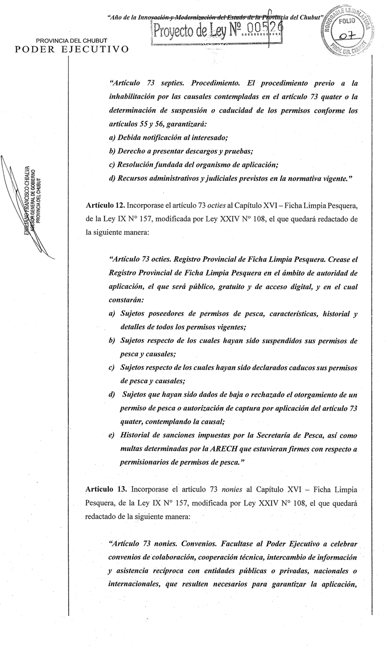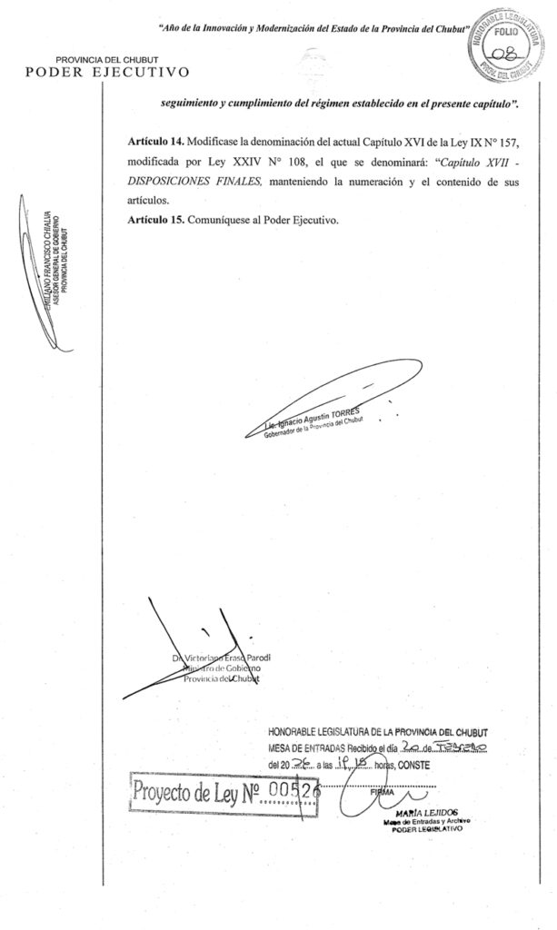 La elevación de la iniciativa fue firmada por el propio gobernador Ignacio Torres y el ministro de Gobierno, Dr. Victoriano Eraso Parodi. El proyecto representa una REFORMA, con mayúscula, de la Ley de Pesca de Chubut, ya que otorga nuevas facultades al Poder Ejecutivo para la “suspensión y caducidad de los permisos de pesca”.