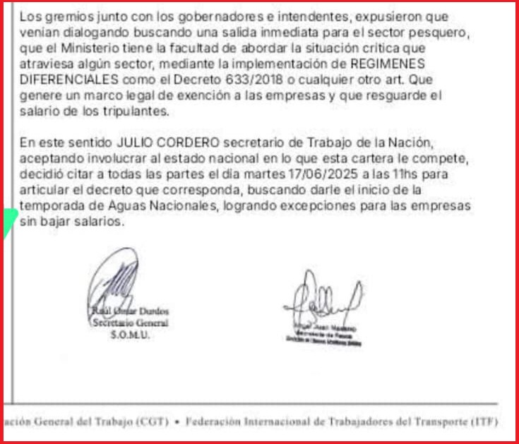 “Los gremios junto con los gobernadores e intendentes, expusieron que venían dialogando buscando una salida inmediata para el sector pesquero, que el Ministerio tiene la facultad de abordar la situación crítica que atraviesa algún sector, mediante la implementación de regímenes diferenciales como el Decreto 633/2018 o cualquier otro artículo que genere un marco legal de exención a las empresas y que resguarde el salario de los tripulantes”, señala expresamente el comunicado oficial dado a conocer por el SOMU, con la firma del secretario General, Raúl Omar Durdos, y el secretario de Pesca, Ángel Juan Navarro, tras la reunión mantenida el viernes en Buenos Aires en la Secretaría de Trabajo de la Nación.