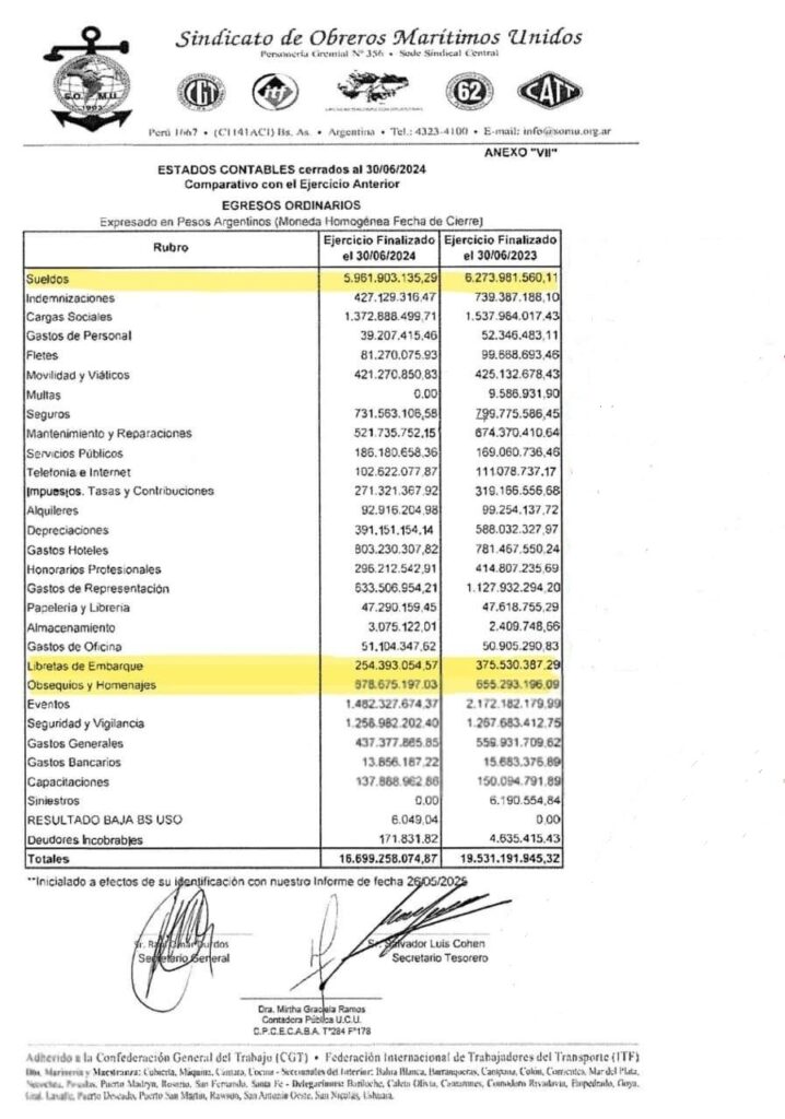 En tanto, en el ejercicio finalizado el 30/06/2024, el sindicato de los marineros gastó en salarios para sus dirigentes un total de $ 5.961.903.135 (cinco mil novecientos sesenta y un millones novecientos tres mil ciento treinta y cinco pesos). Con todo, no se conoce aun la cifra que la entidad gremial gastó en concepto de sueldos en el ejercicio que terminó a mitad del año en curso.