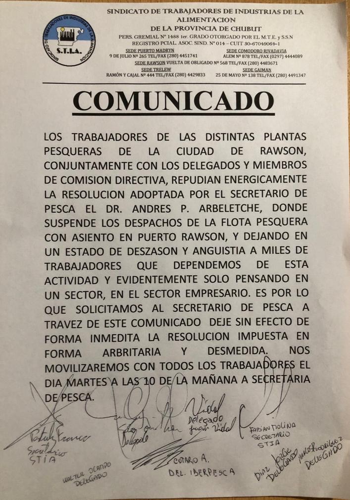 Sostienen que esta situación “deja en estado de desazón a miles de trabajadores que dependemos de esta actividad”, reprochan sobre la medida. “Evidentemente solo pensando en un sector, en el sector empresario. Es por lo que solicitamos al Secretario de Pesca a través de este comunicado que deje sin efecto de forma inmediata la resolución impuesta en forma arbitraria y desmedida”. Finalmente, el STIA avisa que se movilizarán los trabajadores de todas las plantas el martes 2 de enero a las 10 horas a la Secretaría de Pesca.