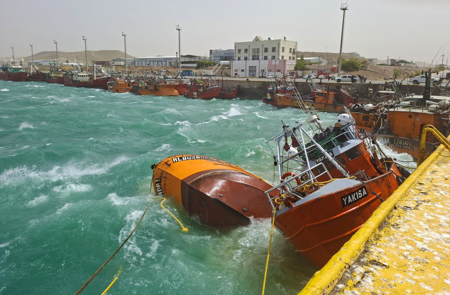 Las embarcaciones estaban amarradas, aunque las defensas no soportaron el impacto continuo de las olas impulsadas por vientos que alcanzaron los 150 km/h. El episodio quedó registrado por trabajadores portuarios y equipos de emergencia que se acercaron por precaución.