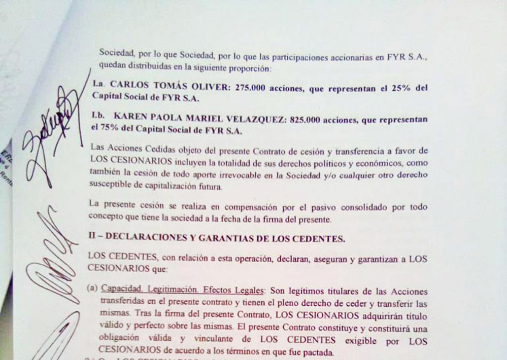 Las participaciones accionarias quedaron distribuidas en la siguiente proporción: “Carlos Tomás Oliver: 275.000 acciones, que representa el 25% del Capital Social de FyRSA. Karen Paola Mariel Velázquez: 825.000 acciones, que representan el 75% del Capital Social de FyRSA”.