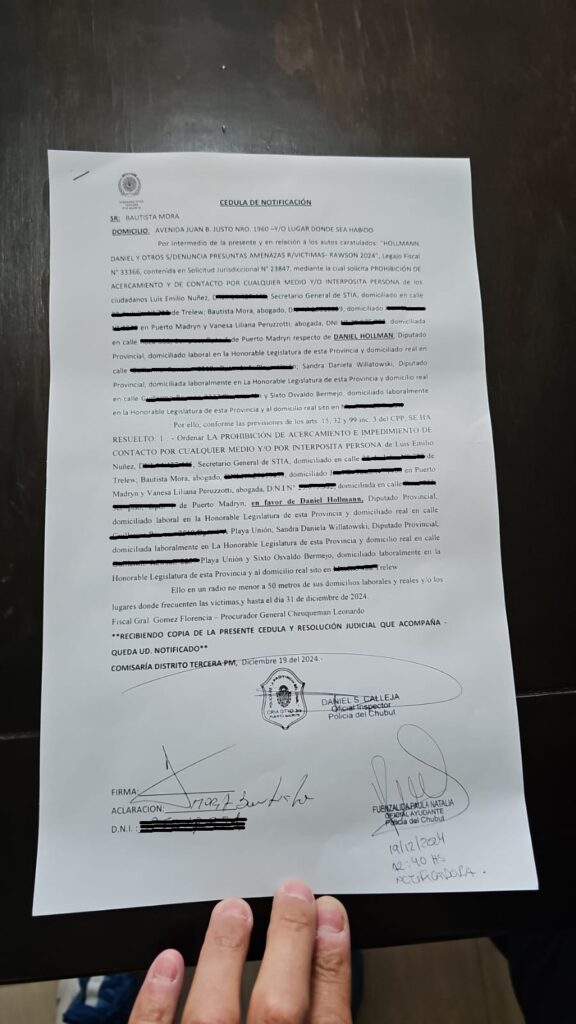 La fiscal General de Rawson, Florencia Gómez, y el procurador General, Leonardo Cheuqueman, solicitaron que se imponga una restricción de acercamiento del titular del STIA Chubut, Luis Núñez, y los abogados Bautista Mora y Vanesa Peruzzotti hacia los diputados provinciales Daniel Hollman, Sandra Willatowski y Sixto Bermejo, y la jueza de Rawson, María Laura Martini, accedió al pedido.