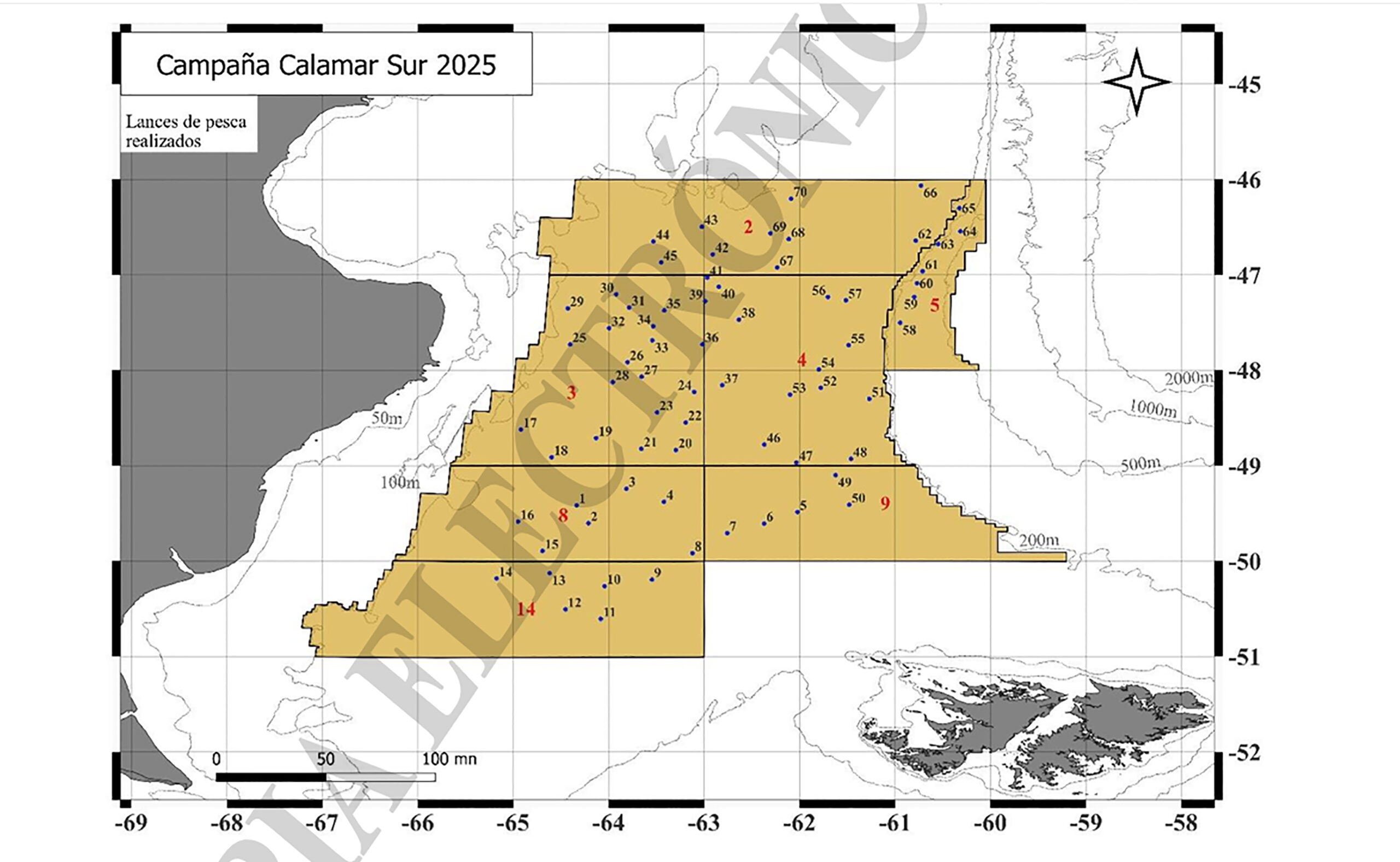La campaña se desarrollará durante aproximadamente 27 días en el área de investigación comprendida entre los paralelos 46°S y 51°S, y entre las isobatas de 100 y 500 metros.