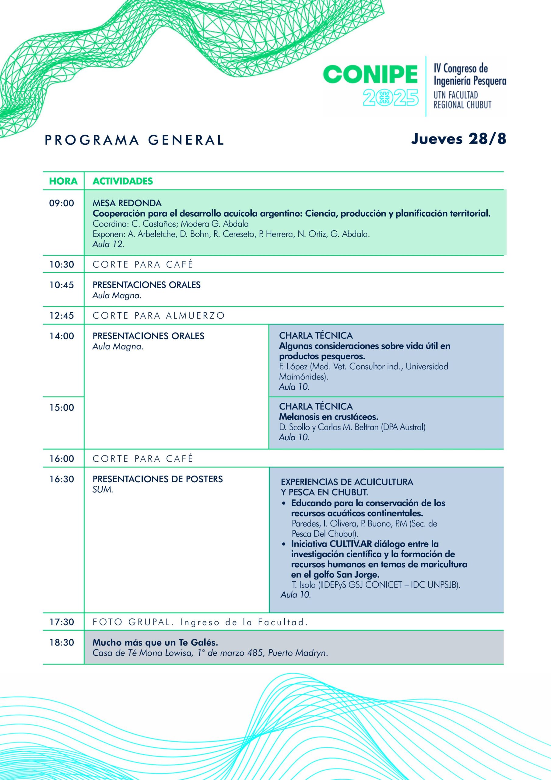 El programa del CONIPE 2025 se organiza en torno a ejes vinculados a los recursos pesquero-acuícolas y su cadena de valor, la economía pesquera y el ambiente, la educación y la investigación aplicada, y las políticas públicas para el sector. Se incluyen mesas redondas, conferencias magistrales, talleres técnicos y actividades culturales abiertas a la comunidad.