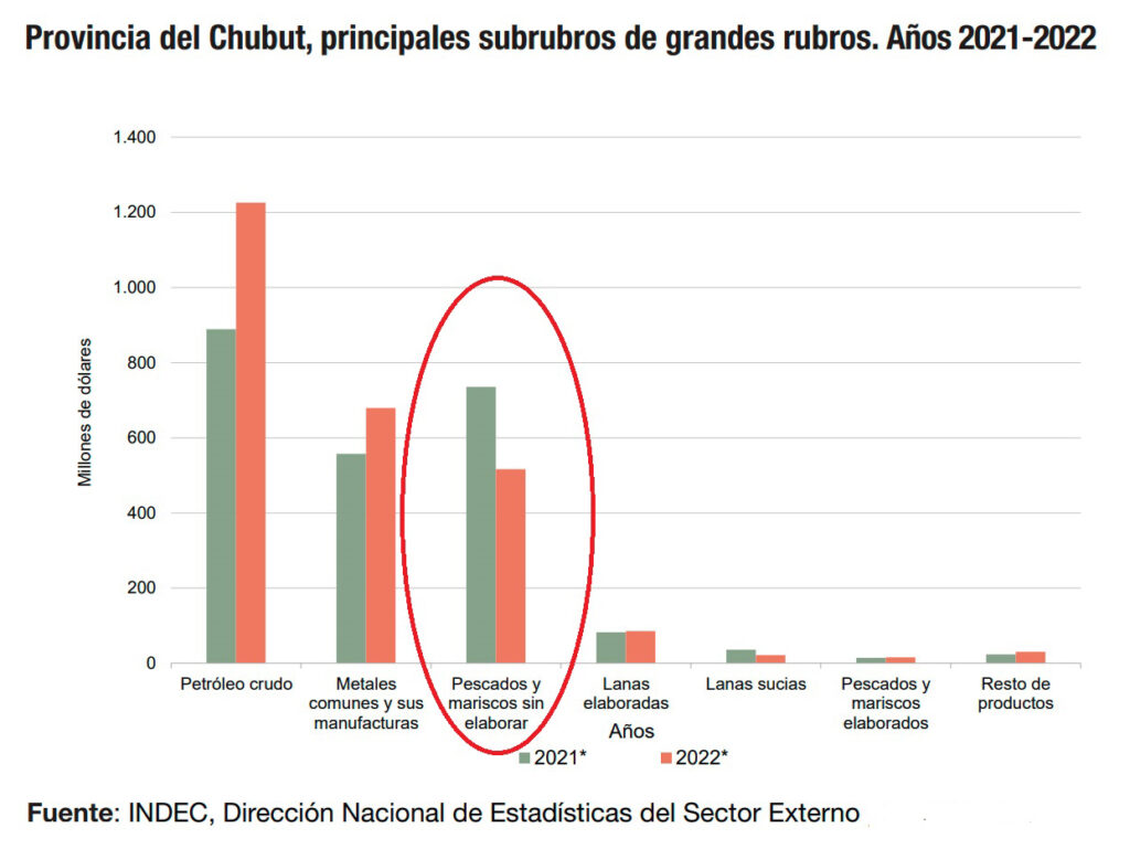 Las exportaciones pesqueras de Chubut pasaron del segundo al tercer lugar en el ranking, al compararse 2021 y 2022. El petróleo sigue siendo el principal sector exportable de la provincia, mientras que metales comunes y sus manufacturas (aluminio) desplazó a pescados y mariscos sin procesar.