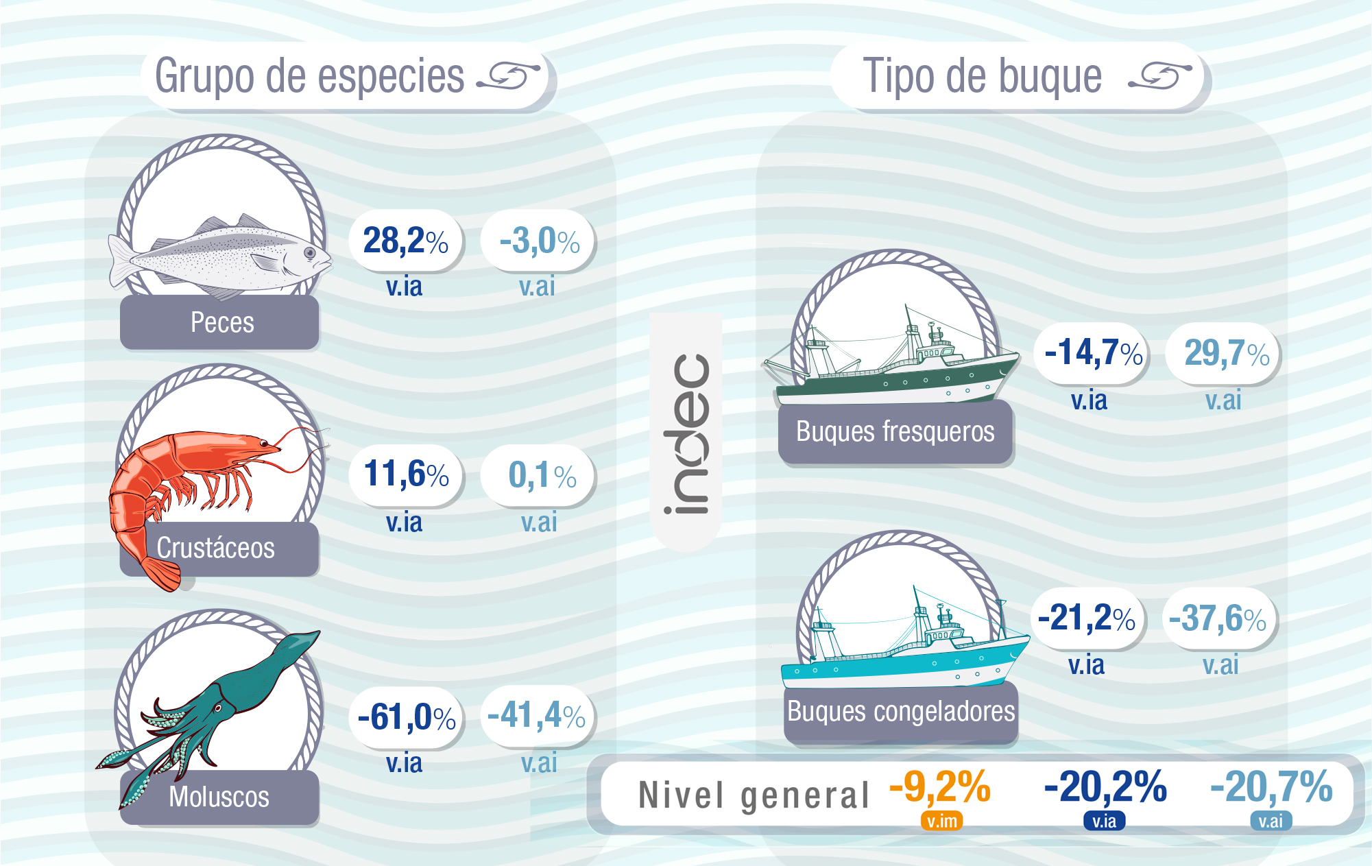 Detalla que los grupos de especies de peces y crustáceos subieron 28,2% y 11,6%, respectivamente, y el de moluscos disminuyó 61%.