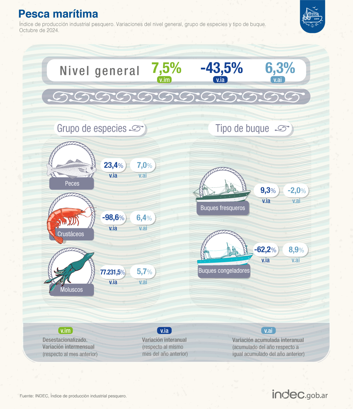 El Instituto Nacional de Estadística y Censos (INDEC) reveló que, en octubre de 2024, el Índice de producción industrial pesquero (IPI pesquero) muestra una caída de 43,5% respecto a igual mes de 2023. El índice de la serie desestacionalizada muestra una variación positiva de 7,5% respecto al mes anterior y el índice de la serie tendencia-ciclo registra una variación negativa de 1,6% respecto al mes anterior.
