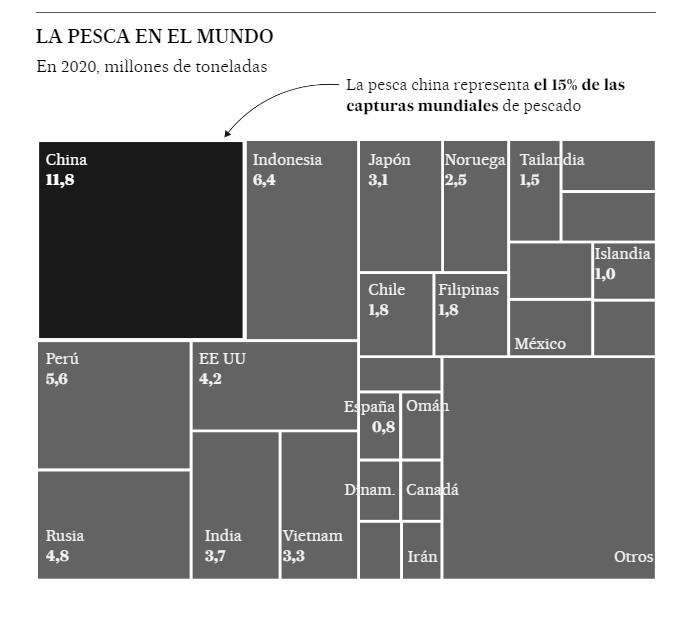 El Estado chino posee la mayor parte de toda esa industria —incluido el 20% de sus barcos de pesca de calamares, conocidos como poteras— y supervisa al resto a través de la Asociación de Pesca de Ultramar. El sector ha ayudado a crear 15 millones de empleos; el país consume más de un tercio del pescado mundial.