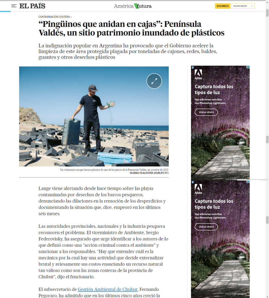 El diario español El País publicó una nota titulada “Pingüinos que anidan en cajas: Península Valdés, un sitio patrimonio inundado de plásticos”, al dar cuenta de la problemática que generan los desechos de diferentes flotas pesqueras.