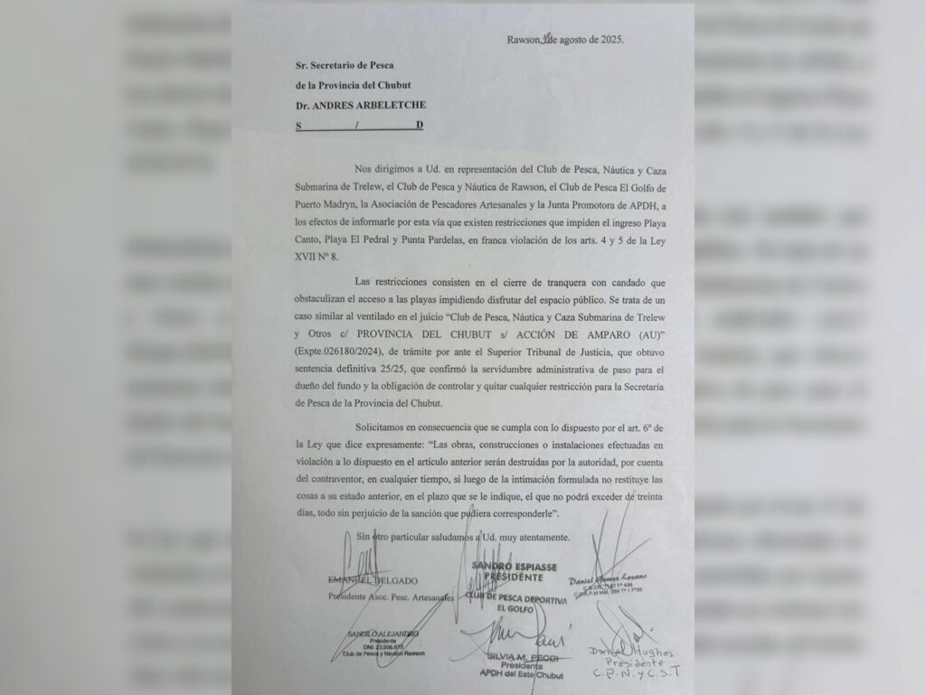 Asimismo, aseguran que las restricciones “consisten en el cierre de tranquera con candado que obstaculizan el acceso a las playas impidiendo disfrutar del espacio público. Se trata de un caso similar al ventilado en el juicio “Club de Pesca, Náutica y Caza Submarina de Trelew y Otros c/ Provincia Del Chubut s/ Acción De Amparo (AU)” (Expte.026180/2024), de trámite por ante el Superior Tribunal de Justicia, que obtuvo sentencia definitiva 25/25, que confirmó la servidumbre administrativa de paso para el dueño del fundo y la obligación de controlar y quitar cualquier restricción para la Secretaría de Pesca de la Provincia del Chubut”, reprochan sobre el accionar de Andrés Pedro Arbeletche en 2024, que después dio marcha atrás en sus pasos reconociendo que se excedió en el uso de las facultades conferidas por ley que norma su cargo.