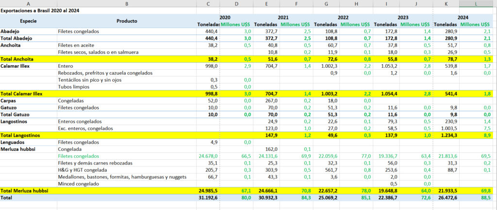 Las exportaciones pesqueras argentinas a Brasil, entre 2020 y 2024, han fluctuado entre 22.000 y 31.000 toneladas, en todos los casos por debajo de los 100 millones de dólares anuales. El año pasado se exportaron al mercado brasileño 26.472 toneladas de productos de la industria pesquera argentina; de los cuales 21.813 toneladas correspondieron a merluza hubbsi, principalmente, filetes congelados.