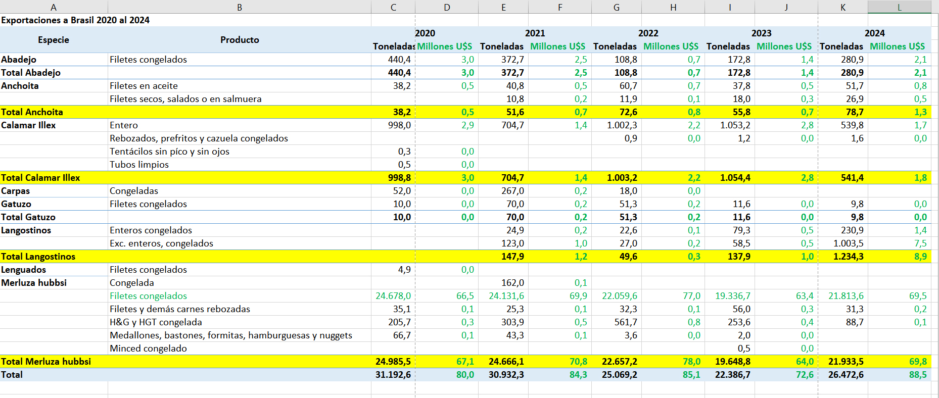 Las exportaciones pesqueras argentinas a Brasil, entre 2020 y 2024, han fluctuado entre 22.000 y 31.000 toneladas, en todos los casos por debajo de los 100 millones de dólares anuales. El año pasado se exportaron al mercado brasileño 26.472 toneladas de productos de la industria pesquera argentina; de los cuales 21.813 toneladas correspondieron a merluza hubbsi, principalmente, filetes congelados.