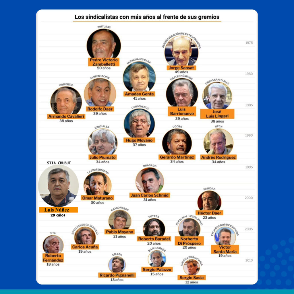 Dentro de la ‘casta sindical’ se encuentran Pedro Zambelletti que lleva 50 años al frente del sindicato de la pintura; Jorge Sansat con 49 años en la Aeronavegación de Entes Privados UPADEP. El lote de “vitalicios” lo componen también Rodolfo Daer de la Alimentación (39 años), el gastronómico Luis Barrionuevo (39 años), Armando Cavalleri de Comercio (38 años), José Luis Lingeri (38 años), el veterano camionero Hugo Moyano (37 años), Gerardo Martínez de la UOCRA (34 años), Andrés Rodríguez de UPCN (34 años).