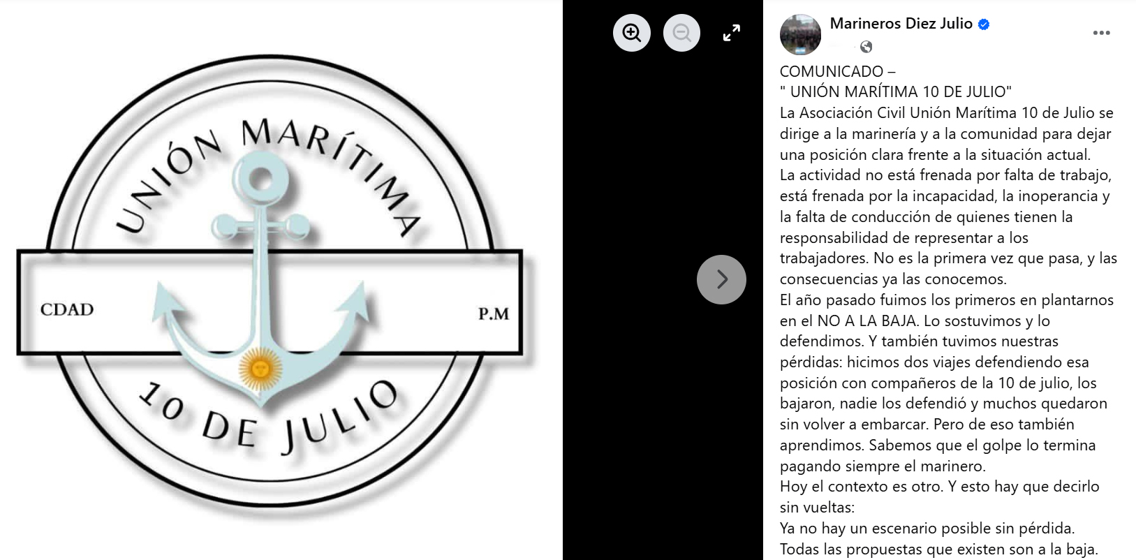 En tanto, en las últimas horas, la Asociación Civil Unión Marítima 10 de Julio emitió un comunicado dirigido a la marinería y a la comunidad para dejar una posición clara frente a la situación actual.
